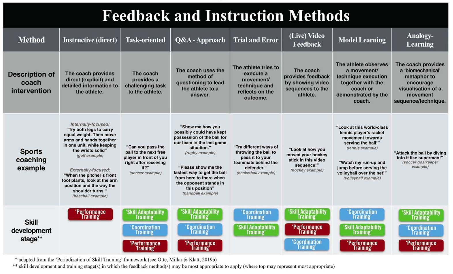 Below, you will find what I consider an interesting matrix that provides a comprehensive overview of the seven feedback and instruction methods. It includes brief descriptions of coach interventions when utilizing each approach and examples of how these methods could be implemented in training.